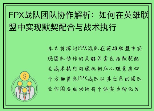 2025-12-05 22:42:20本文将对FPX在《反恐精英:全球攻势》(CS:GO)中的阵地战表现进行深入分析,并总结其战术得失。首先,我们将探讨FPX在阵地战中展现的个人能力与团队配合,随后分析其战术布局和执行力,以及与其他顶尖战队的对比。接着,将评估FPX在不同地图上的表现差异,最后总结该战队在阵地战中所遇到的挑战与应对策略。...